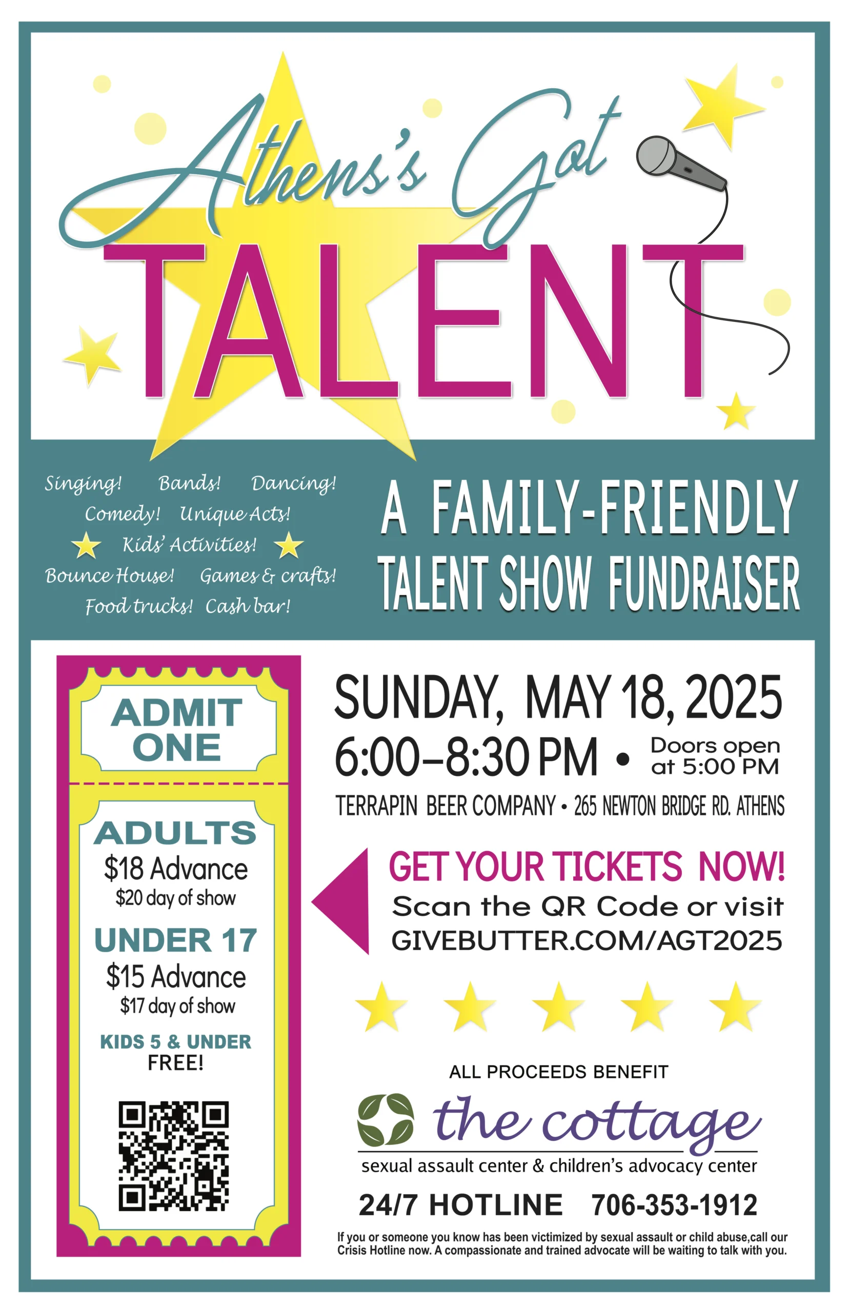Athens has got talent and we’re here to showcase it! Join us Sunday, May 18th from 6pm-8:30pm for our third annual all ages community talent show to benefit The Cottage!